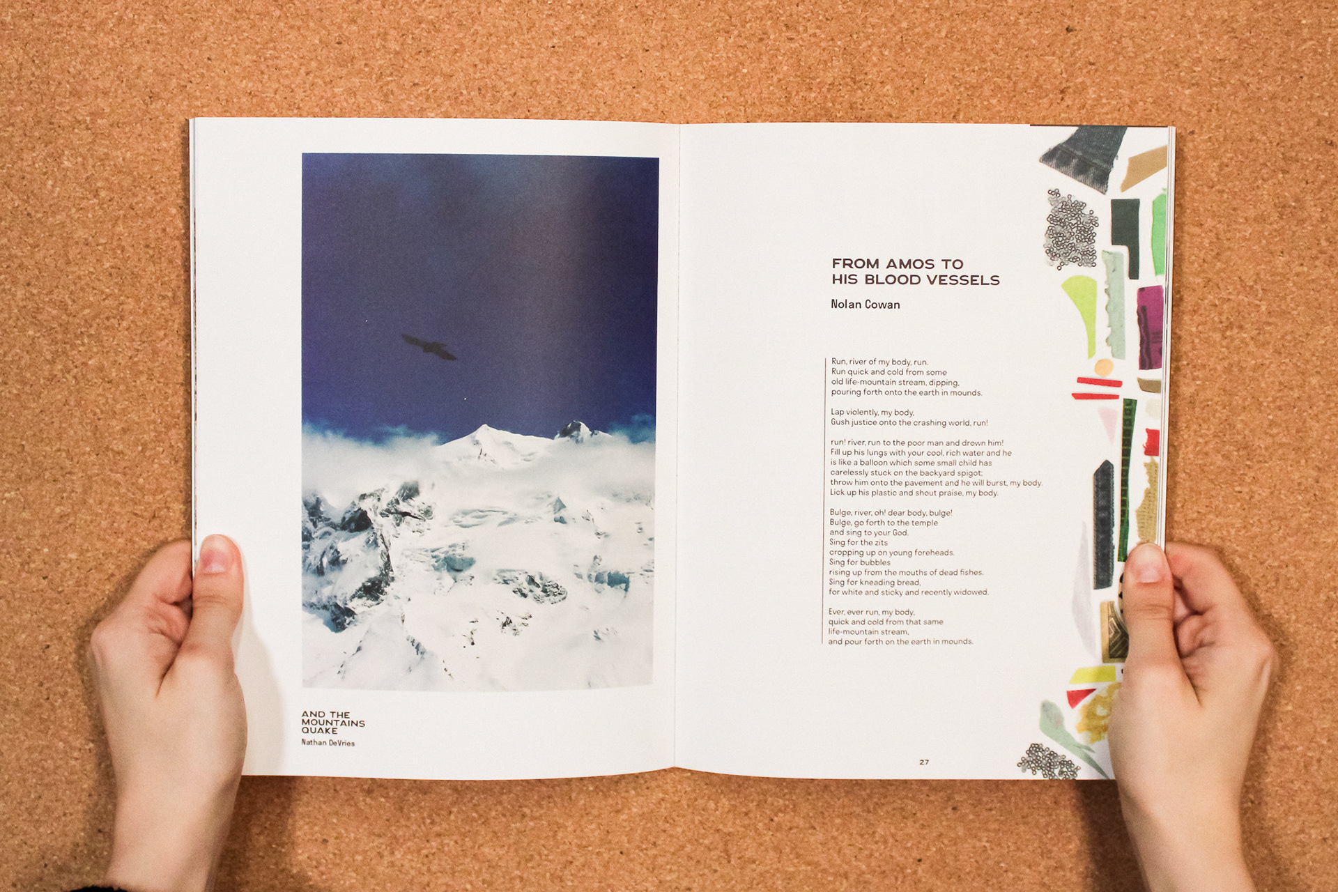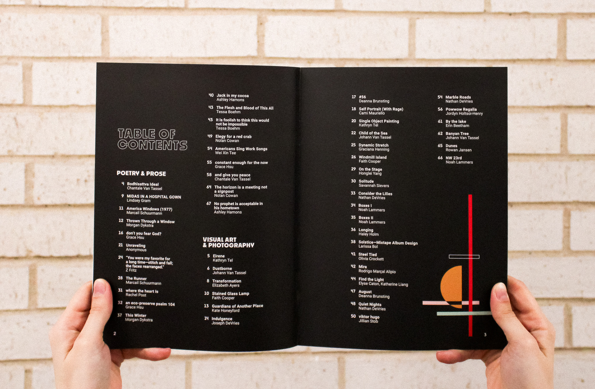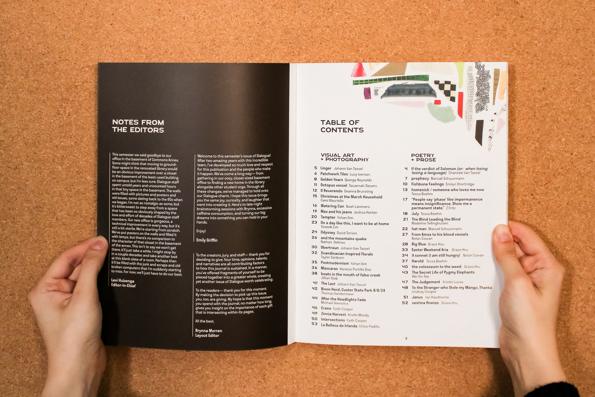 Dialogue is Calvin University’s student-run creative journal. It publishes work in four different categories: prose, poetry, photography, and visual art. For each genre, blind student juries evaluate all submissions and select the finest pieces for publication. As a co-layout editor I have taken on specific responsibilities for Dialogue including making aesthetic decisions such as the color palette, typeface pairings, decorative elements, photography and artwork placement, and the cover design.