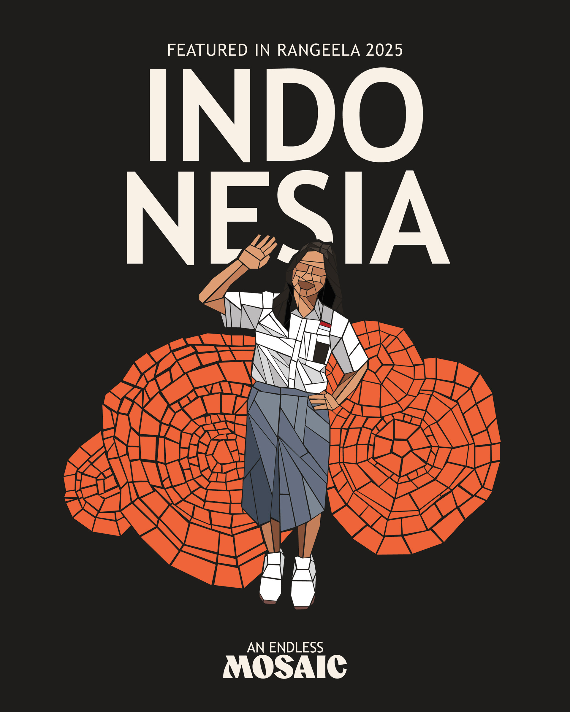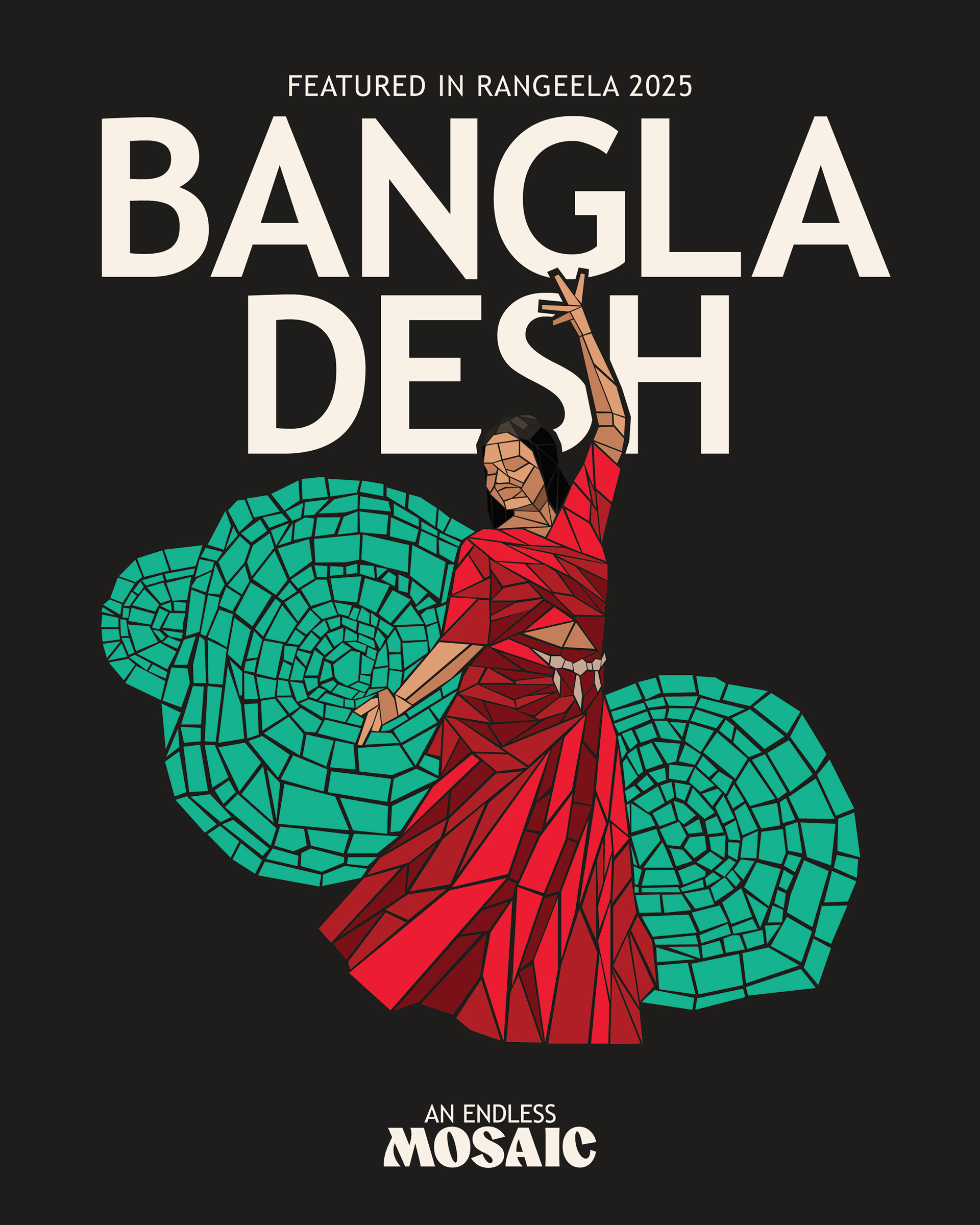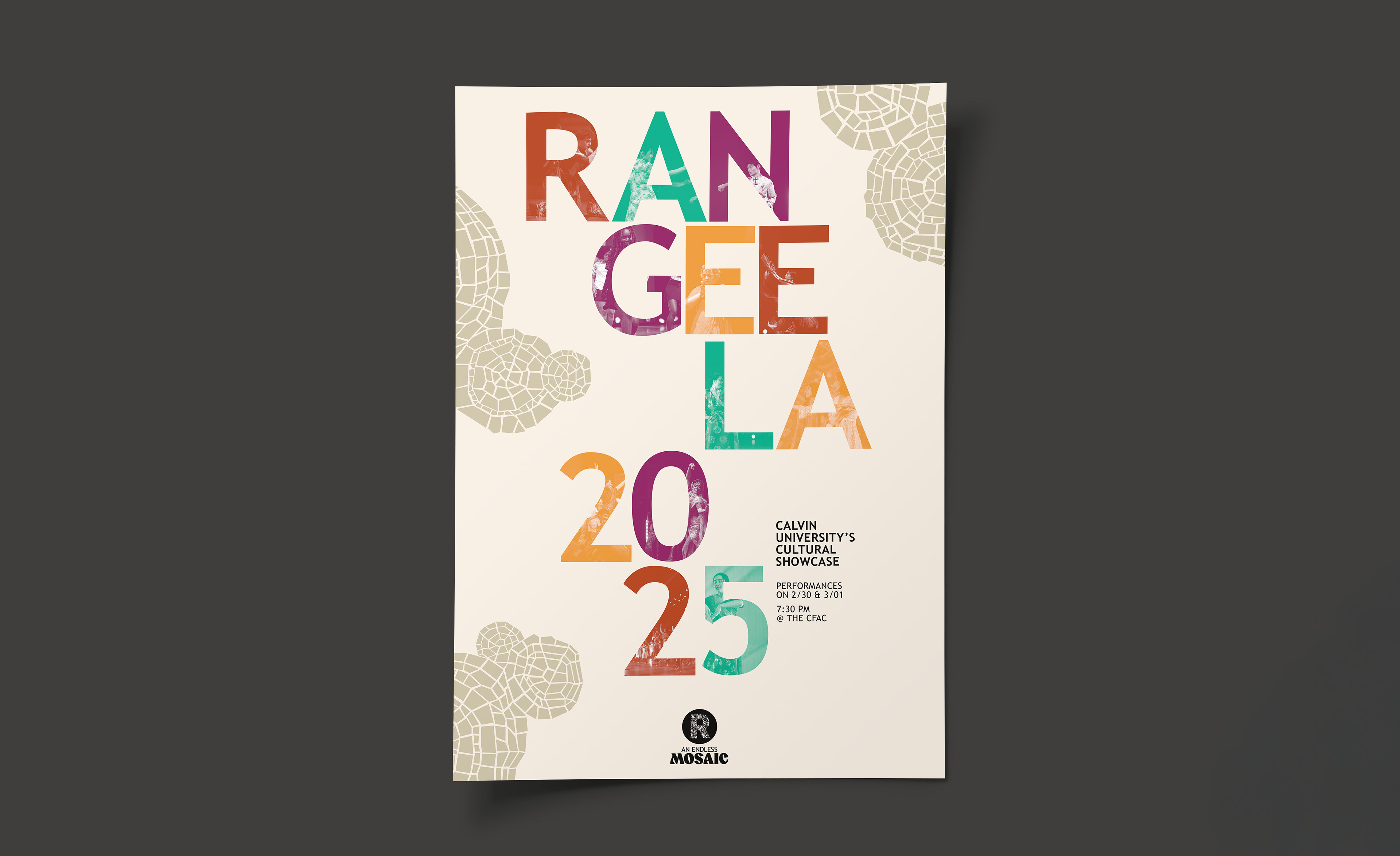 Rangeela, derived from the Hindi word for “colorful”, is a two-night student showcase celebrating cultures from around the world. This year’s theme, An Endless Mosaic, highlights the beauty and value of diversity. Building on Rangeela’s existing circular logo, I created a new word mark for use across social and print media. Over the course of six months, I designed graphics for the showcase spanning social media, print materials, and spatial interventions.